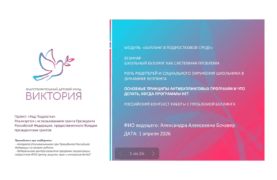 1 апреля прошёл третий вебинар из цикла, посвящённого проблеме буллинга в подростковой среде. Тема встречи: «Основные принципы антибуллинговых программ и что делать, когда программы нет». Вебинар провела эксперт по антибуллинговым программам Александра Бочавер.